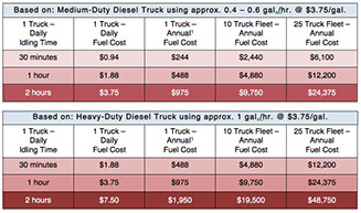 While there are some legitimate reasons trucks and buses need to idle, in many cases excessive idling can be avoided. Even with recent lower fuel costs, it makes sense to shut engines off. Idling gets negative miles to the gallon. Profits are at stake for individual drivers and company fleets, and taxpayer dollars for municipal fleets. A heavy-duty vehicle burns about one gallon an hour. Two hours a day, with diesel at $3.75/gal. can cost more than $1,950 annually (260 day year); a 25 truck heavy-duty fleet brings that to $48,750. Plus, add half again for all vehicles idling excessively due to increased engine maintenance and shortened engine life.