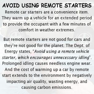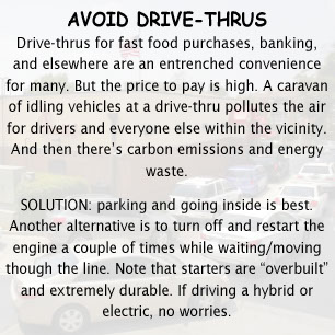 THE CONVENIENCE & COMFORT FACTOR. Some of these tips and information make suggestions that can involve giving up a convenience or comfort, which can be a very personal thing. For instance, when parked on a warm to hot day, is there a willingness to shut off A/C and the engine and open windows instead (or going inside a building) to use a smartphone? Or to shut off and restart the engine once or twice in a drive-thru (or parking and going into the place of business)? Or to forgo a remote starter? This can be an inconvenience, even a sacrifice. But the cost of convenience idling is high, especially collectively. Climate change that has been brought on, in part from human activities including unnecessary idling, will worsen as we allow vehicles to idle to seek relief from the heat. For the sake of our planet, we must break this vicious cycle.
