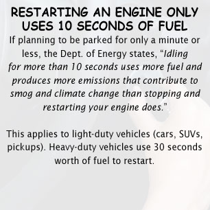 HOW LONG SHOULD A WARMED UP VEHICLE IDLE? The Dept. of Energy Argonne National Laboratory concludes: "Idling for more than 10 seconds uses more fuel and emits more CO2 than engine restarting". However, the break-even time to offset any potential incremental maintenance costs to the starter or battery is 30 seconds. So, as a guideline, if you're stopped out of traffic for more than 30 seconds turn off the engine. TIP: Keep blankets or afghans in your vehicle to use when parked in cold weather to help avoid excessive idling.