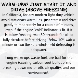 For any light-duty vehicle, 1996 model or newer, assuming properly maintained, the overall stationary warm-up period is just 30 seconds, even in winter. The U.S. Dept. of Energy states it best: "Minimize idling your car to warm it up. Most manufacturers recommend driving off gently after about 30 seconds. The engine will warm up faster being driven, which will allow the heat to turn on sooner, decrease your fuel costs, and reduce emissions."