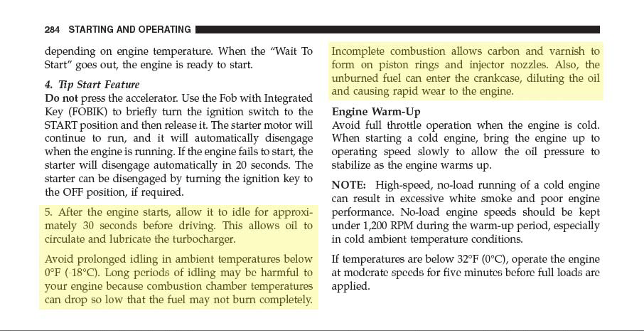 NOTE: It's a myth that idling is good for an engine or doesn't cause additional wear. Excessive idling can create engine wear and carbon soot buildup in the engine and components, and affect the life of engine oil. It can also shorten the life of spark plugs and the exhaust system due to condensation build-up.